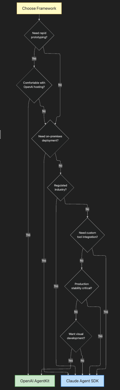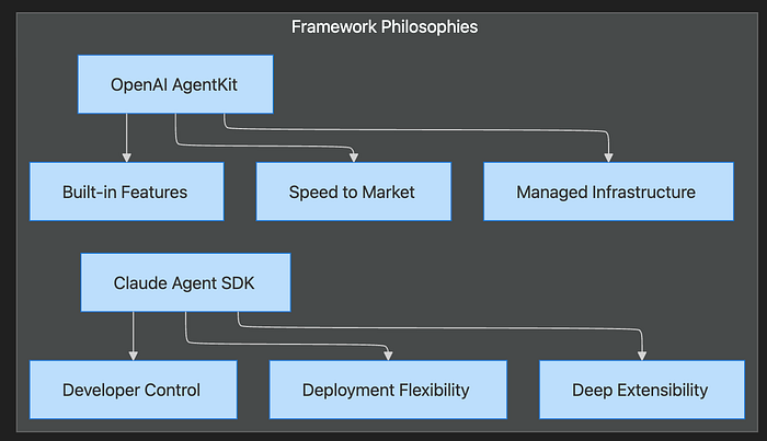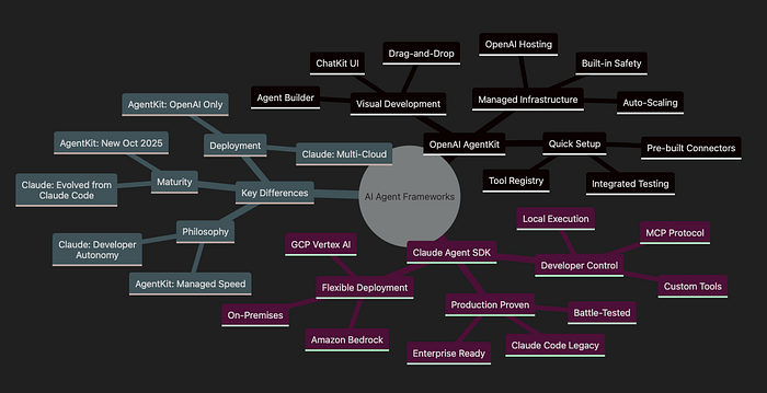 此思维导图展示了这两个框架之间的核心区别。AgentKit 优先考虑速度和托管基础架构,而 Claude Agent SDK 则强调开发者控制,并提供灵活的部署选项。
