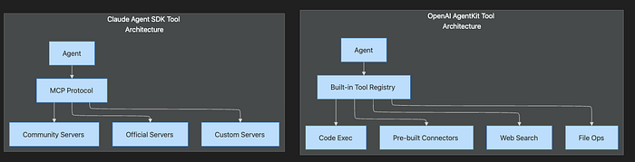 此图展示了工具集成方面的架构差异。AgentKit 使用带有预构建工具的集中式注册表,而 Claude Agent SDK 则利用去中心化的 MCP 协议,允许使用官方、自定义和社区贡献的工具服务器。