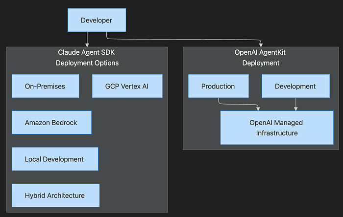 此部署比较展示了 AgentKit 的单一托管路径与 Claude Agent SDK 的多种部署选项。使用 Claude 的开发者可以选择本地、本地或云端部署,而 AgentKit 用户则依赖于 OpenAI 的基础架构。