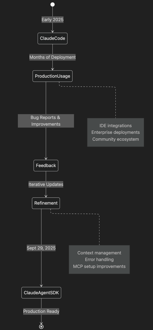 此演变图展示了 Claude Agent SDK 从 Claude Code 到生产环境使用、反馈周期和迭代优化的历程。 2025 年 9 月发布的版本并非代表新技术,而是经过扩展和规范化的成熟技术。