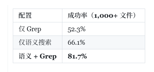 仅语义搜索比 grep 提高了 7.6 个百分点。但结合两者比仅用 grep 提高了 19.9 个百分点——提高了 31%。