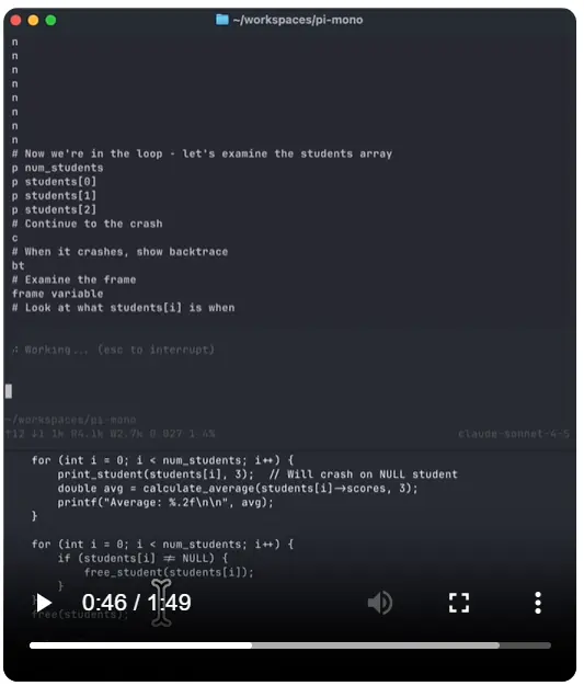 使用 tmux 代替。这里是如何用 pi 调试一个崩溃的 C 程序: