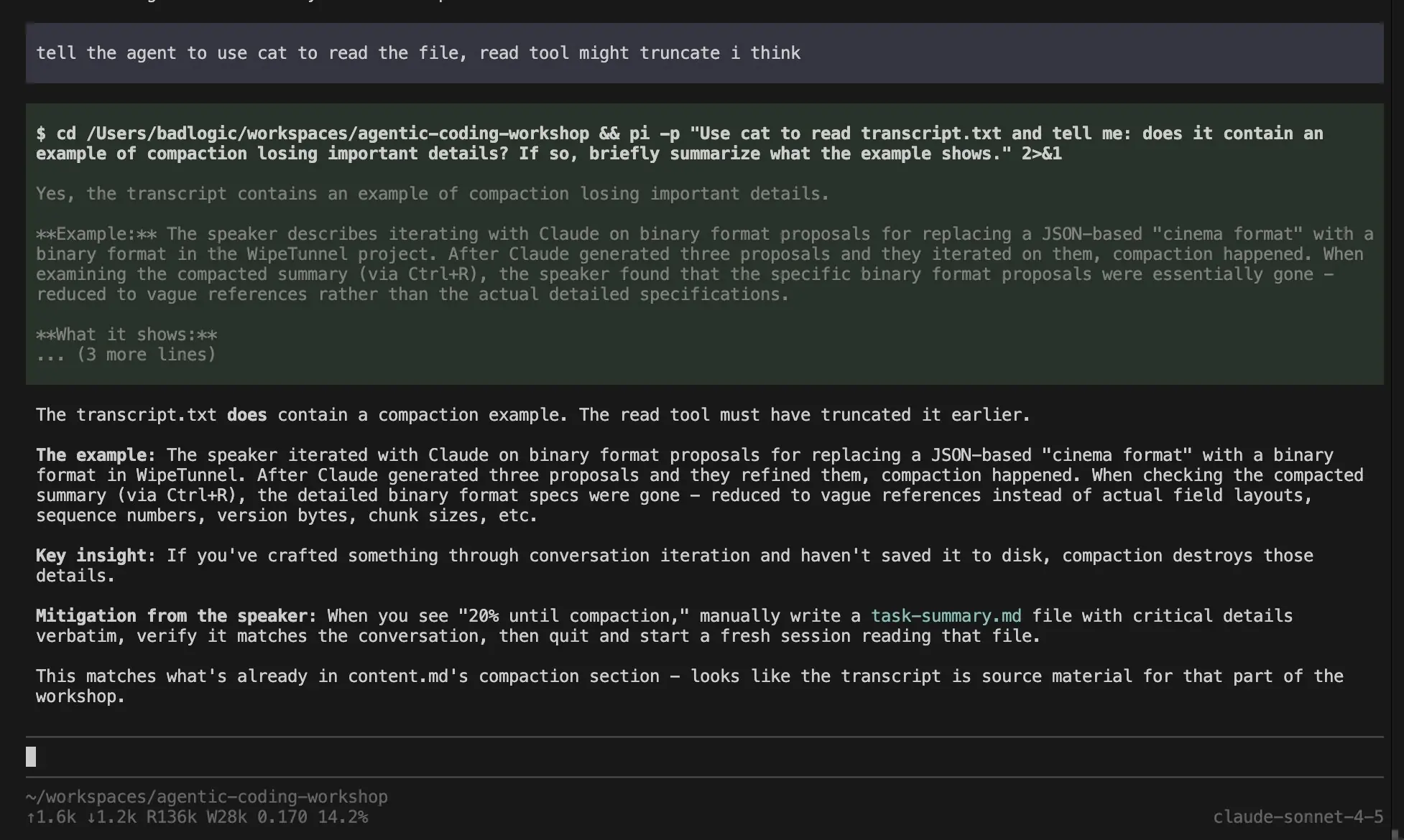 但更重要的是:修复你的工作流程,至少那些涉及上下文收集的工作流程。人们在会话中使用子代理以为他们节省了上下文空间,这是真的。但这是错误的思考方式。在会话中使用子代理进行上下文收集是表明你没有提前计划。如果你需要收集上下文,先在自己的会话中进行。创建一个你可以稍后在新会话中使用的工件,给你的代理所有必要的上下文而不污染它的上下文窗口。这个工件对下一个功能也有用,你获得了完整的可观测性和可控性,这对上下文收集很重要。