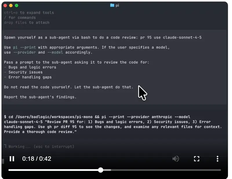 当然,这是一个模拟的用例。实际上,我会直接生成一个新的 pi 会话并让它审查拉取请求,可能将其拉入本地分支。在我看到它的初步审查后,我会给出自己的审查,然后我们一起工作直到它变得良好。这就是我用来不合并垃圾代码的工作流程。