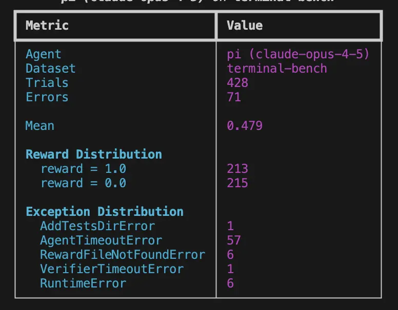 这是我已经提交给 Terminal-Bench 人士的 results.json 文件,用于加入排行榜。pi 的基准运行器可以在 这个仓库 中找到,如果你想要重现结果的话。我建议你使用你的 Claude 计划而不是按需付费。
