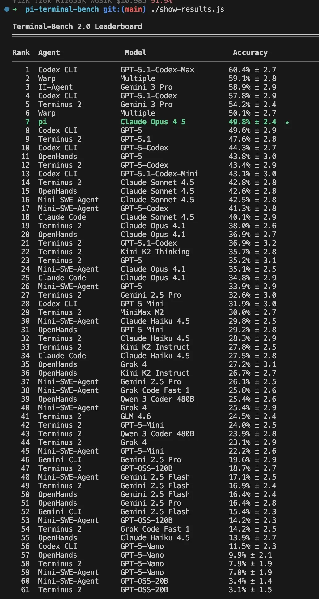 这是 pi 在 2025 年 12 月 2 日的当前排行榜上的位置: