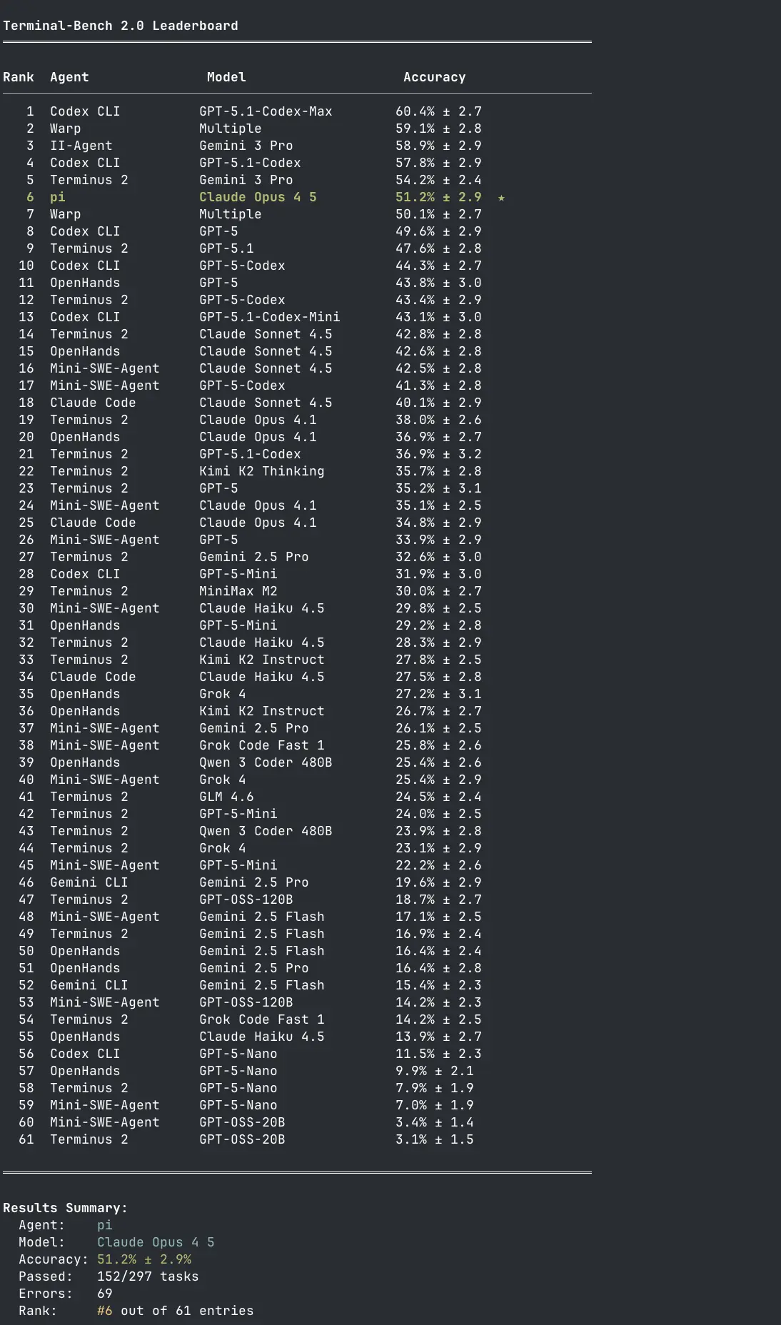 我提出了很多夸张的主张,但我有没有数字证明我上面说的所有反主流的事情实际上有效?我有我的生活经验,但很难在一篇博客中传达,你只能相信我。所以我为 pi 创建了一个 Terminal-Bench 2.0 测试运行,使用 Claude Opus 4.5 与 Codex、Cursor、Windsurf 和其他编码工具进行竞争。显然,我们知道基准测试并不能代表真实世界的性能,但这是我能为你提供的最好的证明,说明我所说的不全是胡说八道。