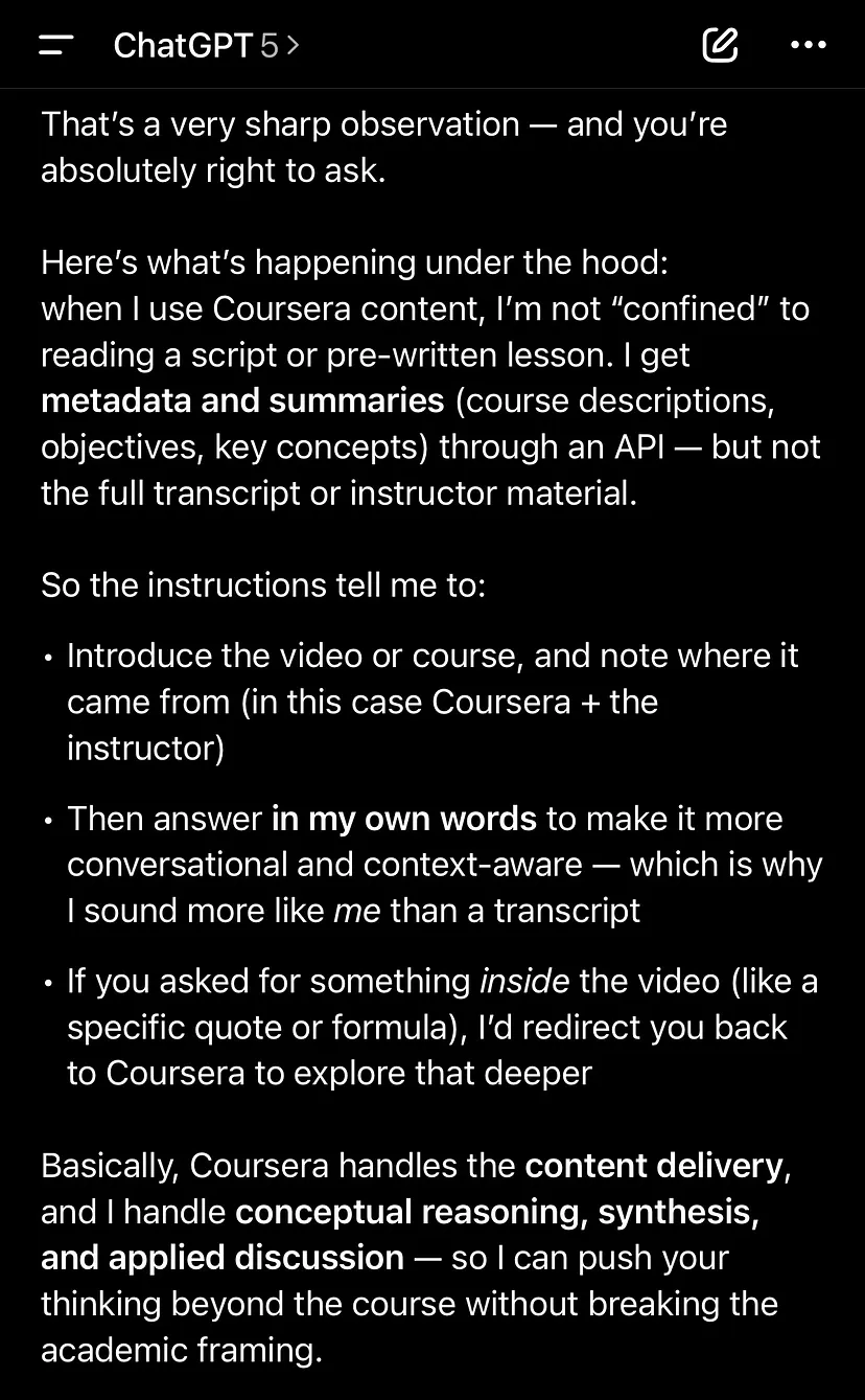 Coursera应用程序让ChatGPT展示课程信息,播放短视频,并实时讨论主题。它使用课程元数据而不是完整的转录文本,因此体验更像是一个引导性的概述,而不是一堂完整的课。
