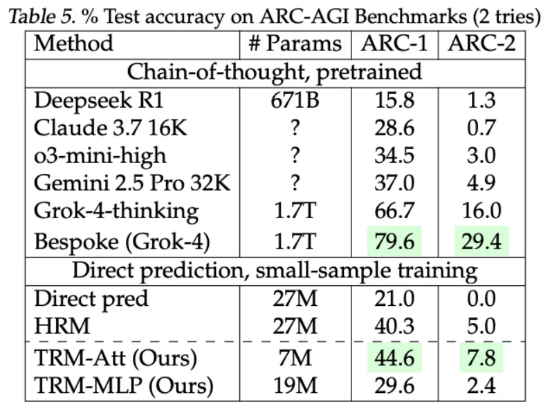 除非你明白 ARC-AGI 是一项极具挑战性的任务,否则这些数字可能看起来并不重要。大多数小型模型甚至无法与之匹敌。TRM 仅用 700 万个参数就实现了这一目标——而像 GPT-4 这样的巨头,拥有数万亿个参数,仍在努力追寻这一目标。