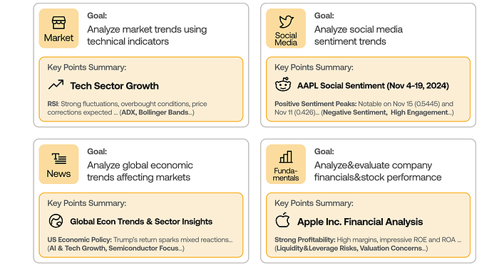 例如,情绪分析师使用网络搜索和情绪评分等工具,而技术分析师则分析模式并计算指标。这种设置反映了真实的交易团队如何协作处理复杂的市场数据。