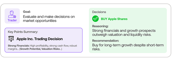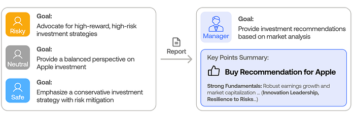 金融交易是一个理想的例子,因为它需要整合许多不同的数据源和专家分析。真正的交易很多公司通过组建专业团队(例如分析师和交易员)来共同做出决策。