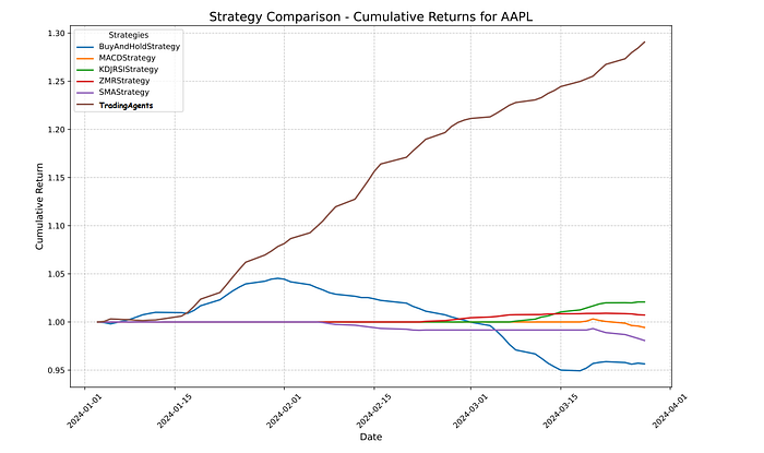 为了评估TradingAgents框架,我们进行了全面的回测模拟,时间跨度为 2024 年 1 月 1 日至 3 月 29 日。本次评估主要关注主要科技股,包括苹果、英伟达、微软、Meta 和谷歌。