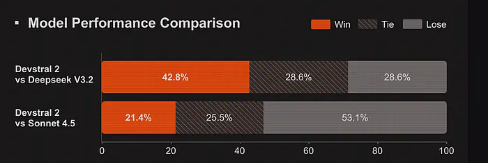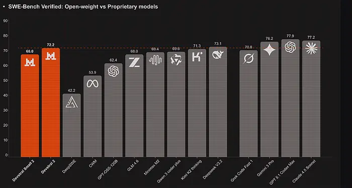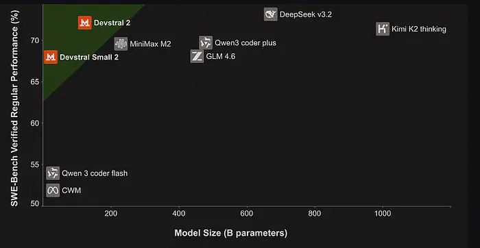 - 其背后是 Devstral 2 (123 字节) 和 Devstral Small 2 (24 字节) 两个模型,它们拥有 256K 上下文信息,并通过了强大的实际编码基准测试 (SWE-Bench)。