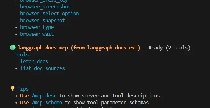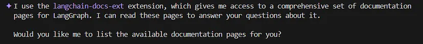 你可以轻松地创建一个扩展来将这个MCP服务器安装到你的Gemini CLI中。例如,假设我们想使用LangGraph项目的llms.txt,以使Gemini CLI了解所有LangGraph文档。要创建这样的扩展,我们在./gemini/extensions文件夹中创建一个名为langgraph-docs-ext的文件夹,包含两个文件: