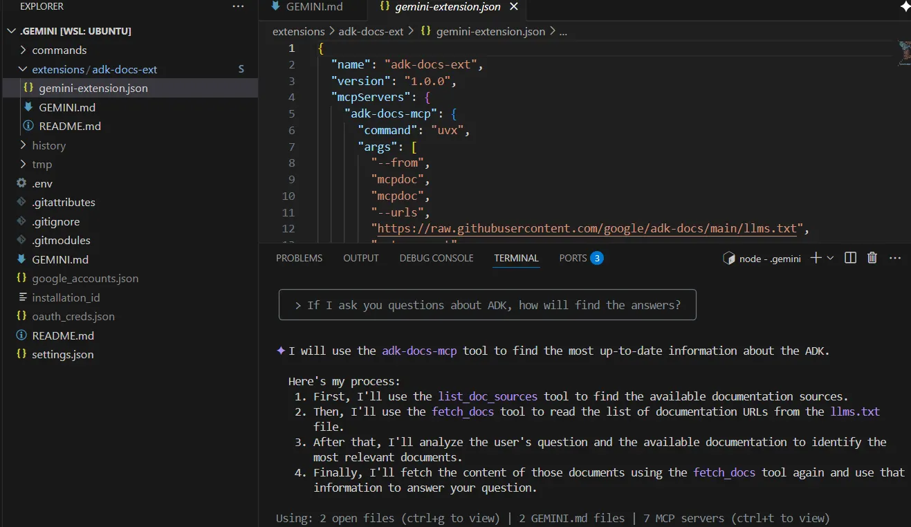 我首先将我预先制作的 ADK-Docs 扩展 克隆到我的 Gemini CLI 全局 ~/.gemini/extensions 文件夹中。然后我更新 gemini-extension.json 以指向我新创建的 llms.txt 文件,我已将其重命名并移动到我的 adk-docs 本地文件夹中: