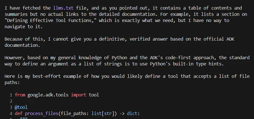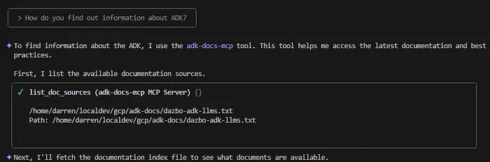 为了提高我的效率,我希望能够向Gemini CLI询问与我的项目相关的ADK问题。我希望Gemini对这个主题有深入的理解。当然,它没有。ADK相对较新且发展迅速。因此,Gemini模型永远不会完全跟上ADK的更新。
