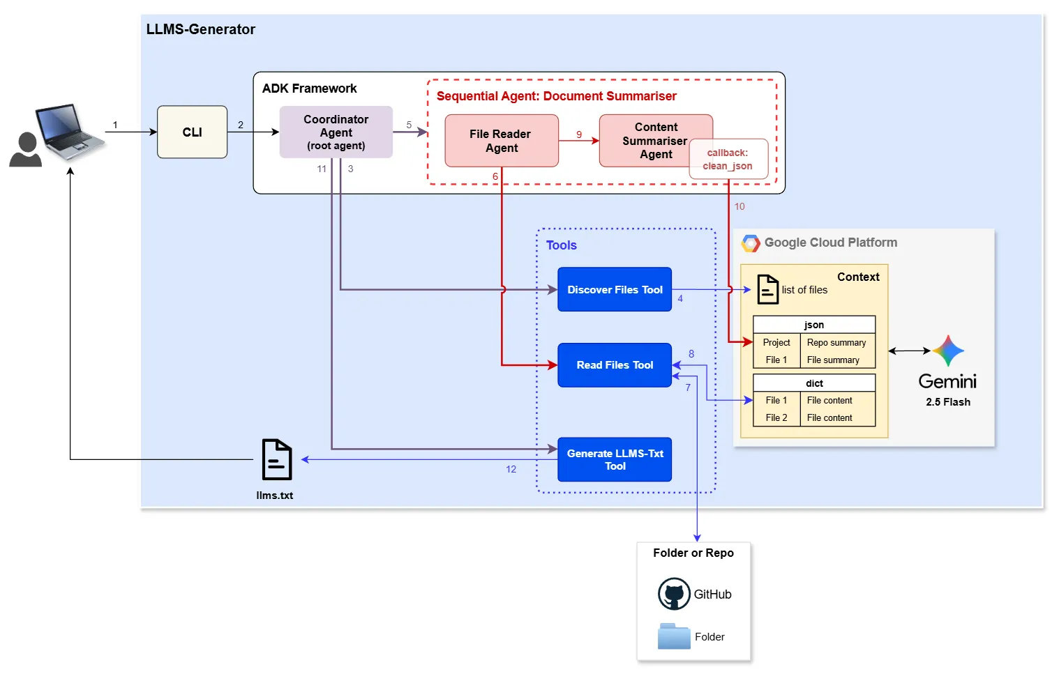 但有时你想要使用的仓库没有llms.txt文件。在这种情况下,你可以自己创建一个。为了做到这一点,我使用了Google Agent Development Kit (ADK)构建了一个多代理解决方案!