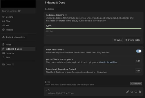 如果你使用的是 Cursor,最快且最直接的选项可能是尝试 内置的文档索引 功能。在编辑器中选择 @Docs -> Add New Doc,或者进入 Cursor -> Settings -> Cursor Settings -> Indexing & Docs -> Add docs。在地址栏中输入库的文档地址,后面加上 /,例如 https://ox.softwaremill.com/latest/。过一段时间后,文档应该会被索引,在我们的案例中,使用的是 Ox 名称。