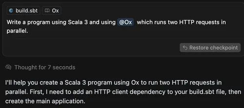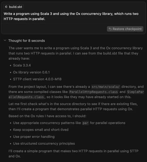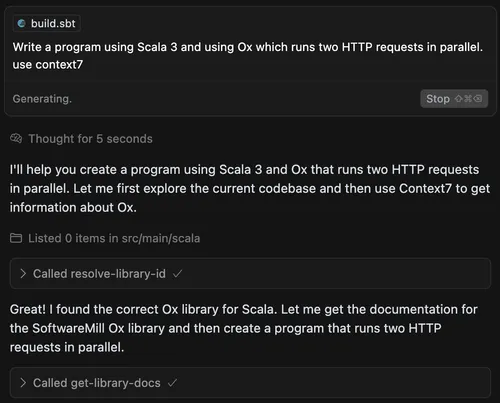 请记住,对于某些语言,结合上述方法和 MCP 服务器可能会获得更好的结果,这使得你可以探索项目中的可用 API 并运行编译和测试。在 Scala 的情况下,这样的 MCP 服务器是可用的。