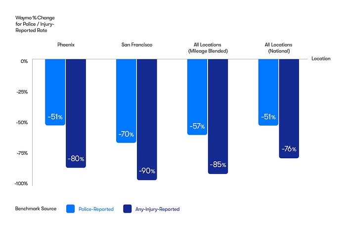 数据也证实了这一点(见下图)。与人类驾驶员相比,Waymo 的车辆在造成人员伤亡的事故中减少了 85%,在警方记录的事故中减少了 57%,总体事故率降低了 2.3 倍。当 94% 的碰撞事故都是人为错误造成的时,这种差异并非微不足道,而是根本性的。