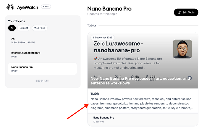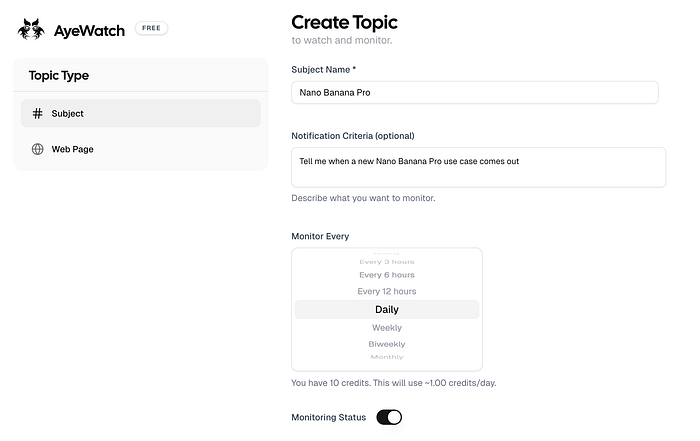 在“创建主题”页面,您可以追踪某个主题,也可以指定要监控的网页。例如,我希望在 Nano Banana Pro 图像模型的新用例发布并在 X 或 Reddit 上成为热门话题时收到通知。