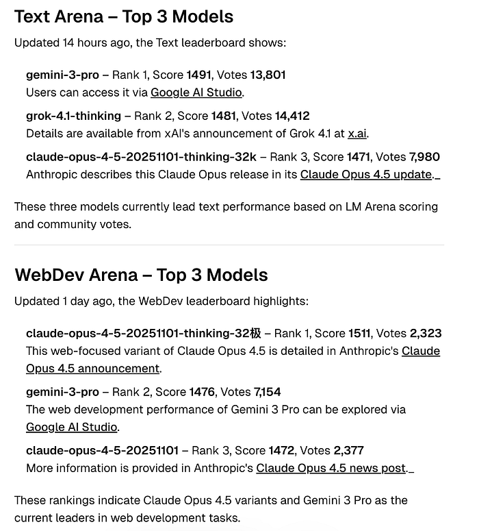 Text: Gemini 3 Pro, Grok 4.1 Thinking, and Claude Opus 4.5 Thinking (32k) as the top three.