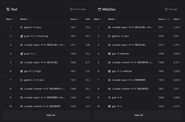 WebDev: Claude Opus 4.5 (thinking and standard variants) and Gemini 3 Pro leading.