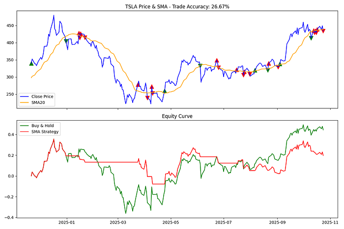 顶部面板: 价格序列、SMA 和交易进入(绿色向上三角形表示盈利,红色表示亏损)和退出(向下三角形)的视觉标记。