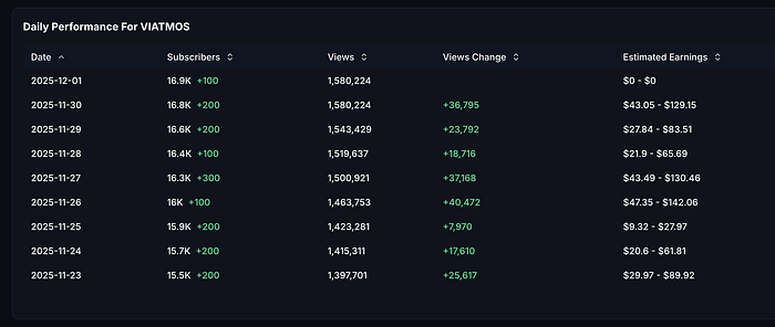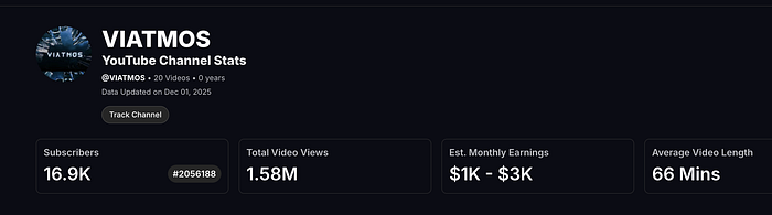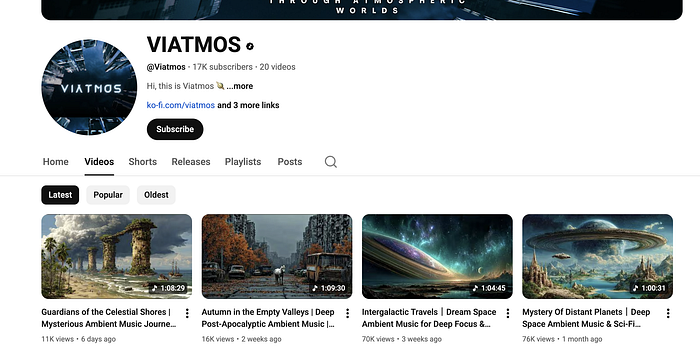 这位创作者三个月前才开始发布人工智能音乐。目前只有 20 个视频,就已经拥有 1.7 万订阅者。我用 Vidiq 查了一下——这个频道每月收入在 1000 到 3000 美元之间,而且这个数字还在持续增长。