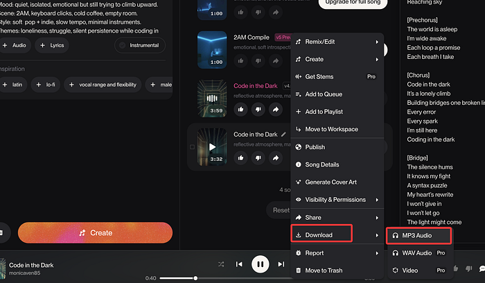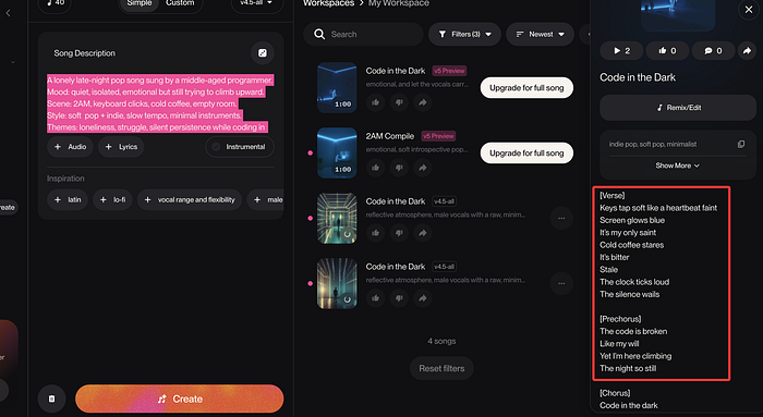 SUNO 生成了四个版本的歌曲。我不能在这里分享它们,但相信我——它们惊人地准确。它捕捉到了我脑海中的一切:凌晨2点的安静时刻,敲击代码,啜饮冰冷的咖啡,半疲惫,半充满希望。