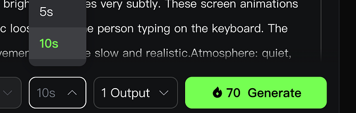 选择时长(5 秒 = 35 积分,10 秒 = 70 积分)。点击生成。