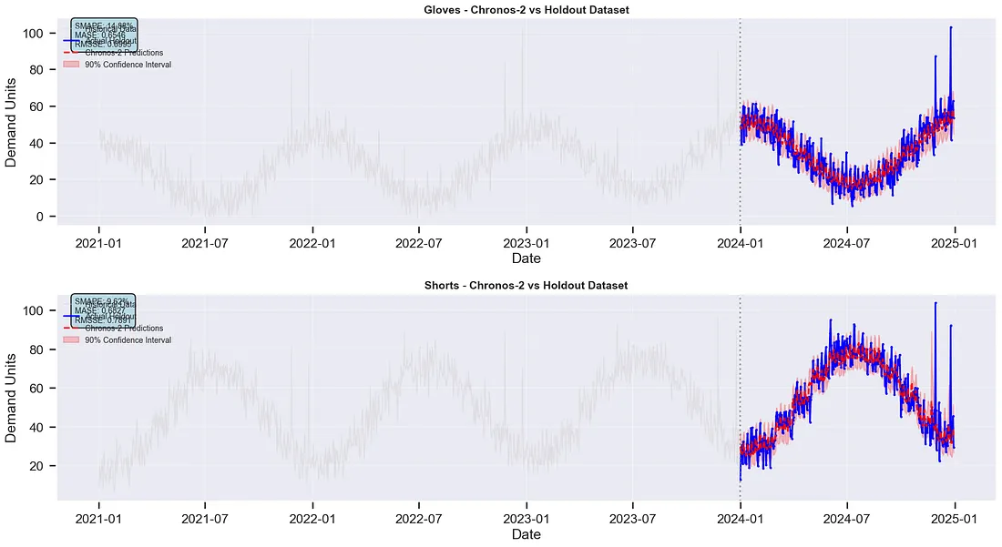 下图比较了Chronos-2 的预测(红色)与两种产品的实际 2024 年需求(蓝色)。