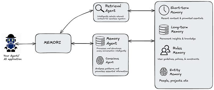 Memori使用一个多代理系统,由三个专门的AI代理协同工作。记忆代理智能地处理和构建每一次对话,Consciou代理会分析模式并推送重要信息,检索代理会智能地选择相关上下文,实现无缝注入。