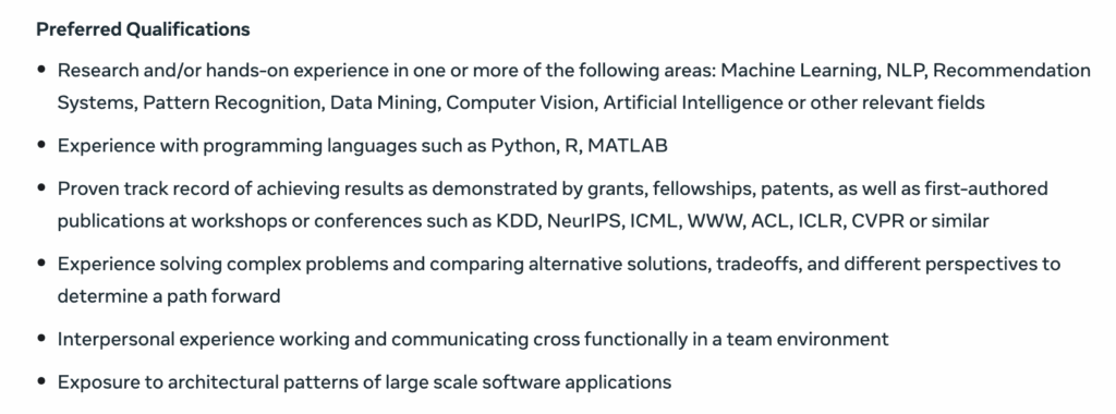 如果你查看 Meta 的产品数据科学家职位,你会发现其技术水平通常比核心人工智能研究工程师或高级数据科学家更适合市场上大多数数据科学家。