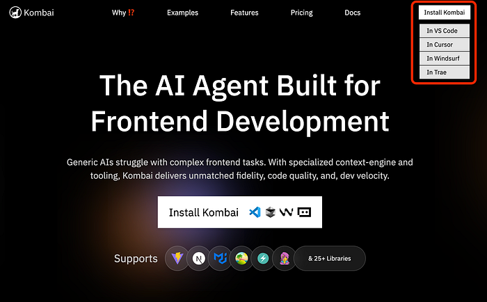 要安装 Kombai,请访问其官方网站,并将鼠标悬停在页面右上角的“安装 Kombai”按钮上。您将看到要安装它的 IDE 选项。