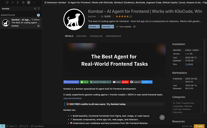 以下是 Cursor IDE 中 Kombai 安装的示例截图。