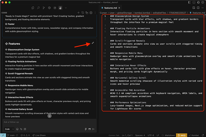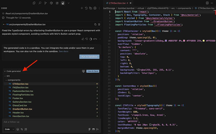 - 首次构建通常可以完美编译。使用其他工具时,我通常会陷入修复 AI 导致的错误,但使用 Kombai,初始输出几乎总是能够成功编译。