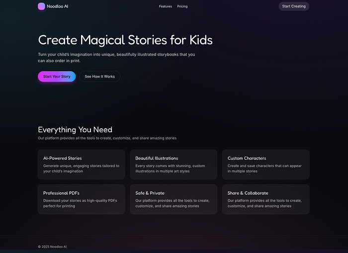 举个例子,我将尝试为我最新的 Web 应用程序创建一个落地页,该应用程序使用 AI 创建儿童故事书。