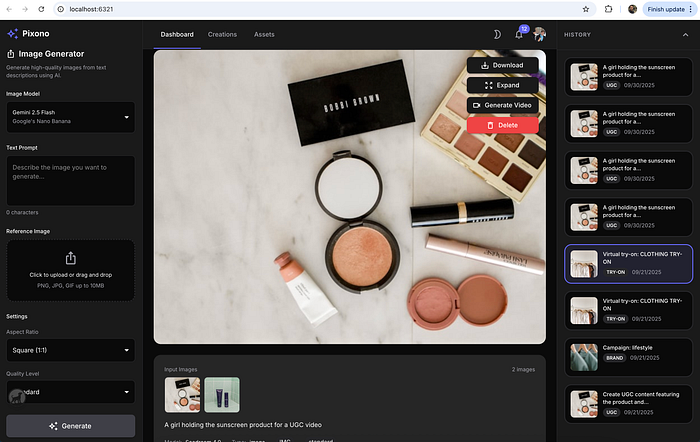 Central canvas area displaying the generated image with action buttons (Download, Expand, Generate Video, Delete)