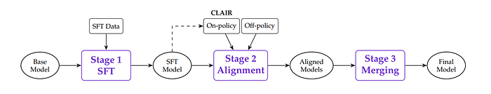 - 后训练流程(3 个阶段):SFT(基于聊天/指令数据的监督式微调)— 偏好对齐(策略内 + 策略外)— 模型合并(使用混合/线性合并来增强鲁棒性)。