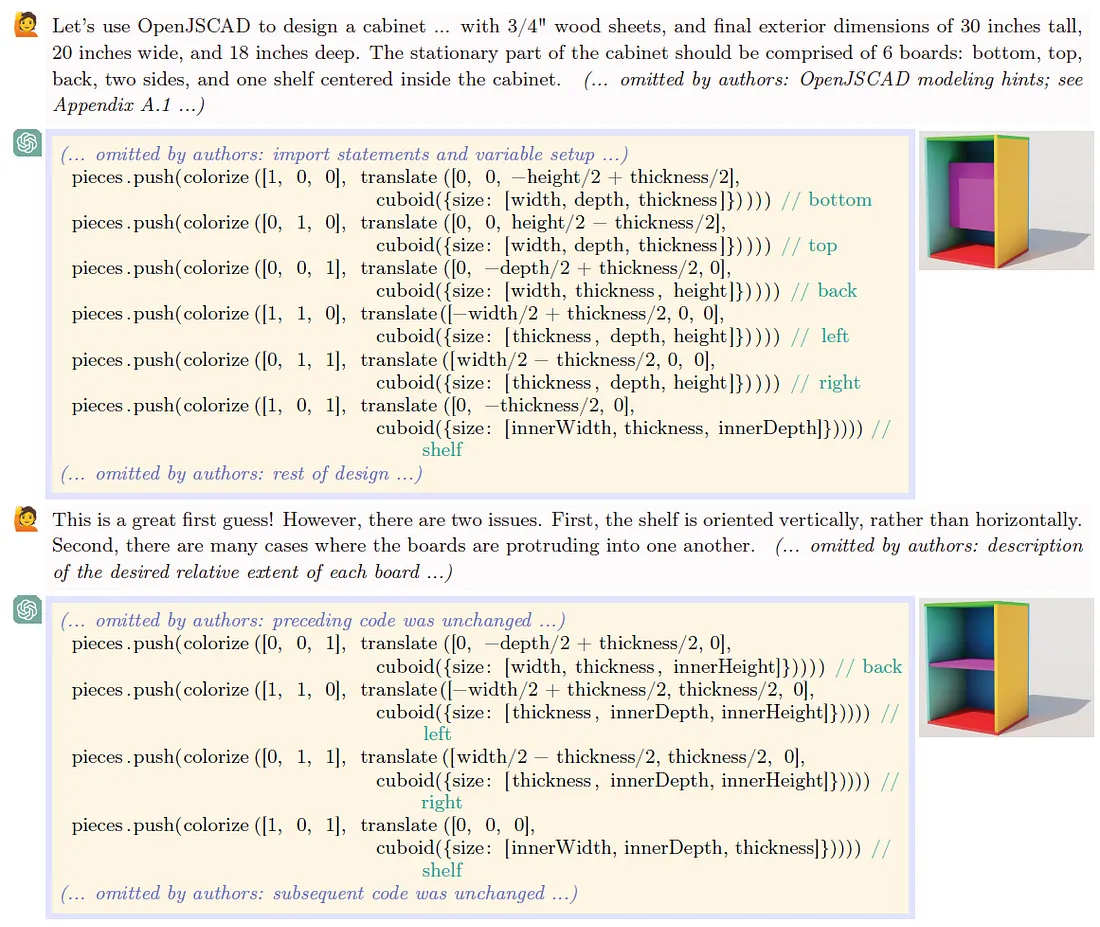 LLM的一种具体应用是CAD代码生成。现代参数化CAD系统(如OpenSCAD、Onshape FeatureScript、CadQuery)以程序或脚本的形式表示模型。研究人员已经提示LLM从高层描述中编写此类代码。例如,给定一个提示“设计一个带有搁板的简单柜子”,GPT-4(通过OpenJSCAD,一个基于JavaScript的CAD库)生成了一个合理的脚本,其中包括有意义的变量名和注释[1]。