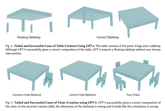 LLM缺乏对三维空间的内置理解。它们常常难以像CAD系统或工程师那样进行几何推理[3]。例如,在一次实验中,GPT-4错误地放置了柜子的部件——它将搁板垂直放置而不是水平放置,或者让板子相互交叉[2]。