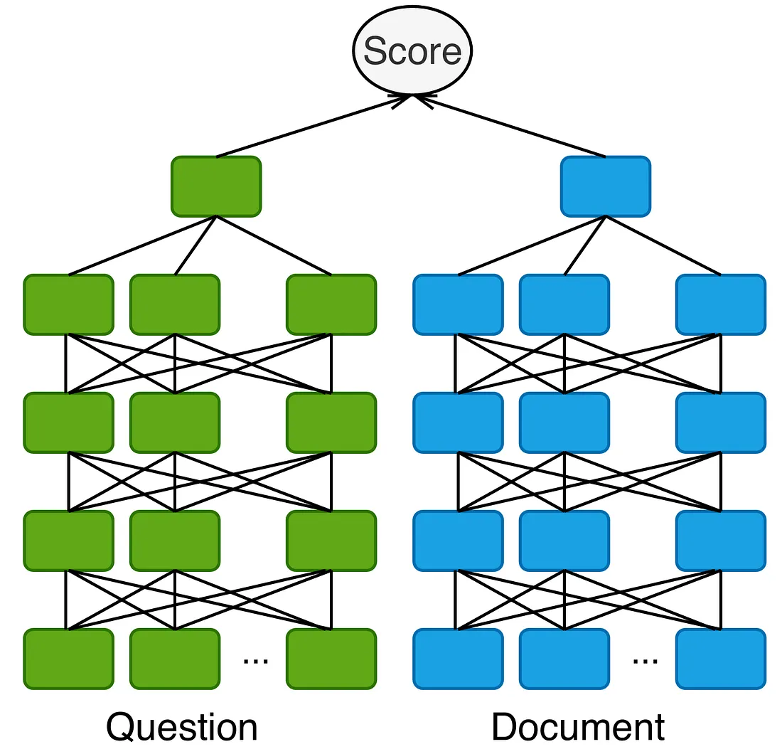 - 缺点: 需要为每个文档存储密集向量,这会消耗大量的内存。此外,如果你更新编码器(塔),你需要重新构建整个索引,这成本很高。此外,随着查询和文档变长,基于嵌入的检索系统的性能往往会下降。
