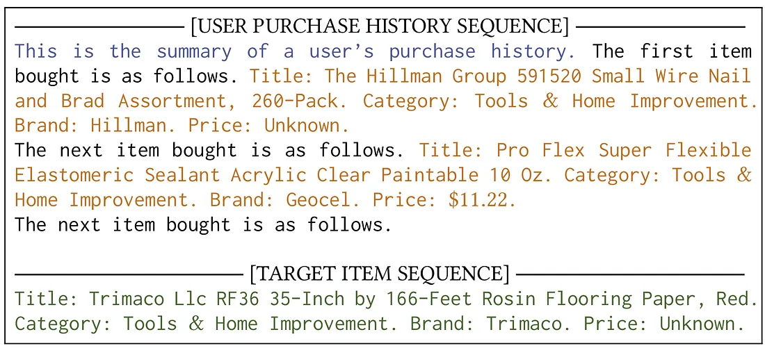 使用LLM进行项目推荐的一个例子如图4所示,用户的过去购买历史被作为列表提供给LLM,然后模型被要求预测下一个项目。这样,LLM直接输出最可能购买的下一个产品。为了使模型更熟悉完整的项目目录,微调步骤通常是很有帮助的。