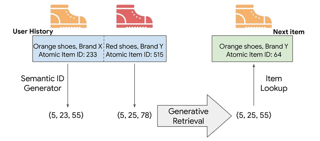 除了生成完整的文档或产品标题,LLM还可以使用语义ID进行检索。这些是由数字(或标记)组合而成的结构化标识符,其中序列的每一部分编码项目的特定属性。
