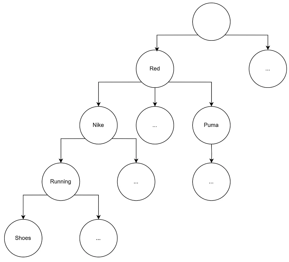 解决方案是受限解码(Constrained Decoding)。通过在每个生成步骤中限制输出空间,我们可以确保模型只能生成对应真实项目标题(或DocIDs)的有效序列。一种常见的方法是使用一个前缀树(trie),建立在目录上。例如,在鞋店目录中,树确保模型只生成有效的商品标题,如“Nike跑步鞋”或“Adidas凉鞋”,而不是随机或虚构的名称。