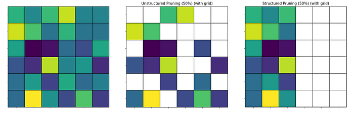 - 非结构化剪枝根据其重要性移除单个权重。这可能导致高度稀疏的权重矩阵和更小的内存占用,但通常需要专门的硬件或库才能获得真正的加速,因为稀疏模式是不规则的。