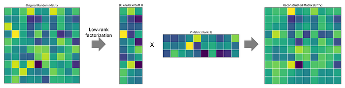 这个过程在下面的图中有所说明,其中 10x10 的矩阵被分解为两个低秩矩阵的乘积:U(10x3)和 V(3x10)。正如我们所看到的,这两个矩阵的乘积成功地重建了原始矩阵,捕捉了其关键特征。