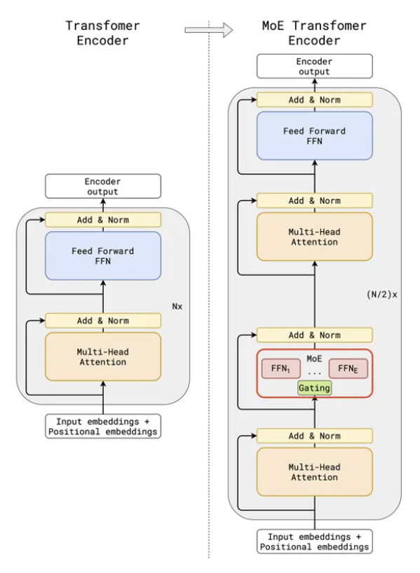 下图显示了一个典型的 MoE 架构,左边显示了一堆 N 个 Transformer 层,每个层都有一个单一的 MHA 子层,然后是一个 FFN 子层。相比之下,右边显示了一堆 N/2 个 Transformer 层,其中较低 Transformer 层的 FFN 子层已被替换为 MoE 层。