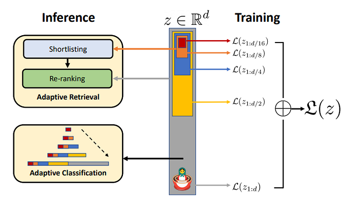 这个概念在上面的图中得到了说明:维度为 d 的完整嵌入位于中心,包围着多个逐步缩小的子嵌入——d/2、d/4、d/8 和 d/16。在训练过程中,每个子嵌入都会生成自己的任务损失,所有这些损失的组合构成了整体的训练目标。换句话说,每个子嵌入都与完整的嵌入一起优化,朝着相同的下游目标,确保跨尺度的一致性。